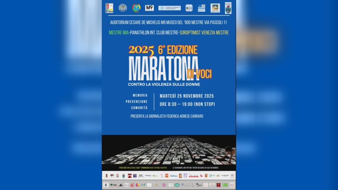 Torna il 25 novembre all’Auditorium Cesare De Michelis di M9 la Maratona di Voci 2025, appuntamento cardine del palinsesto “Novembre Donna” del Comune di Venezia. Dalle 8:30 alle 13:30 e dalle 15 alle 19, Mestre diventerà un palcoscenico civico dove istituzioni, scuole, associazioni, mondo culturale e realtà sportive uniranno le proprie voci contro la violenza di genere. L’evento è promosso da Mestre Mia, Soroptimist Club Mestre Venezia e Panathlon International Club Mestre, con ingresso libero e diretta streaming sulla pagina Facebook di Mestre Mia.