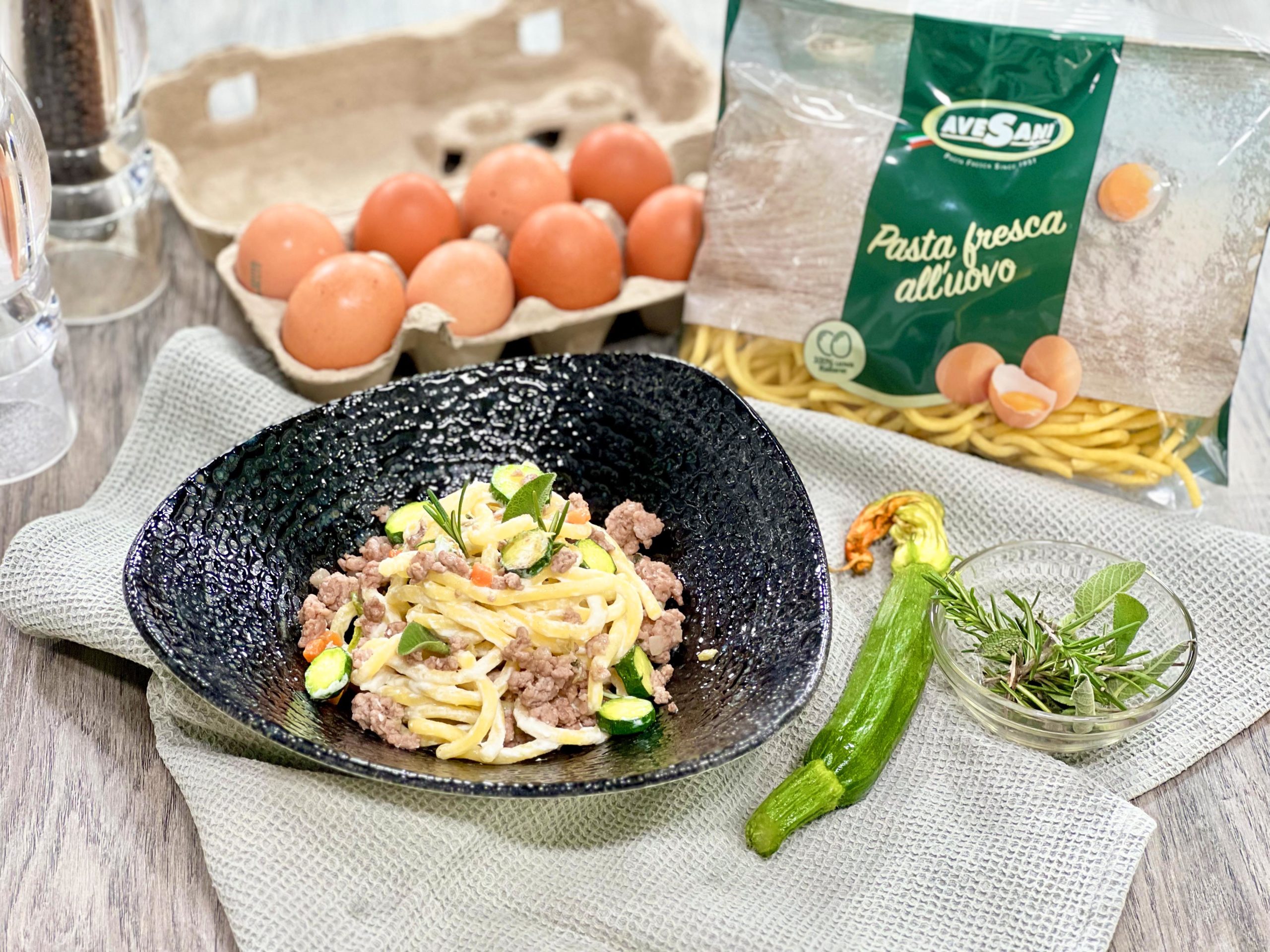 - condire la pasta con il ragù bianco completato con un trito di erbe aromatiche a piacere e mantecando il tutto con la ricotta, una noce di burro, i fiori di zucca ed il parmigiano