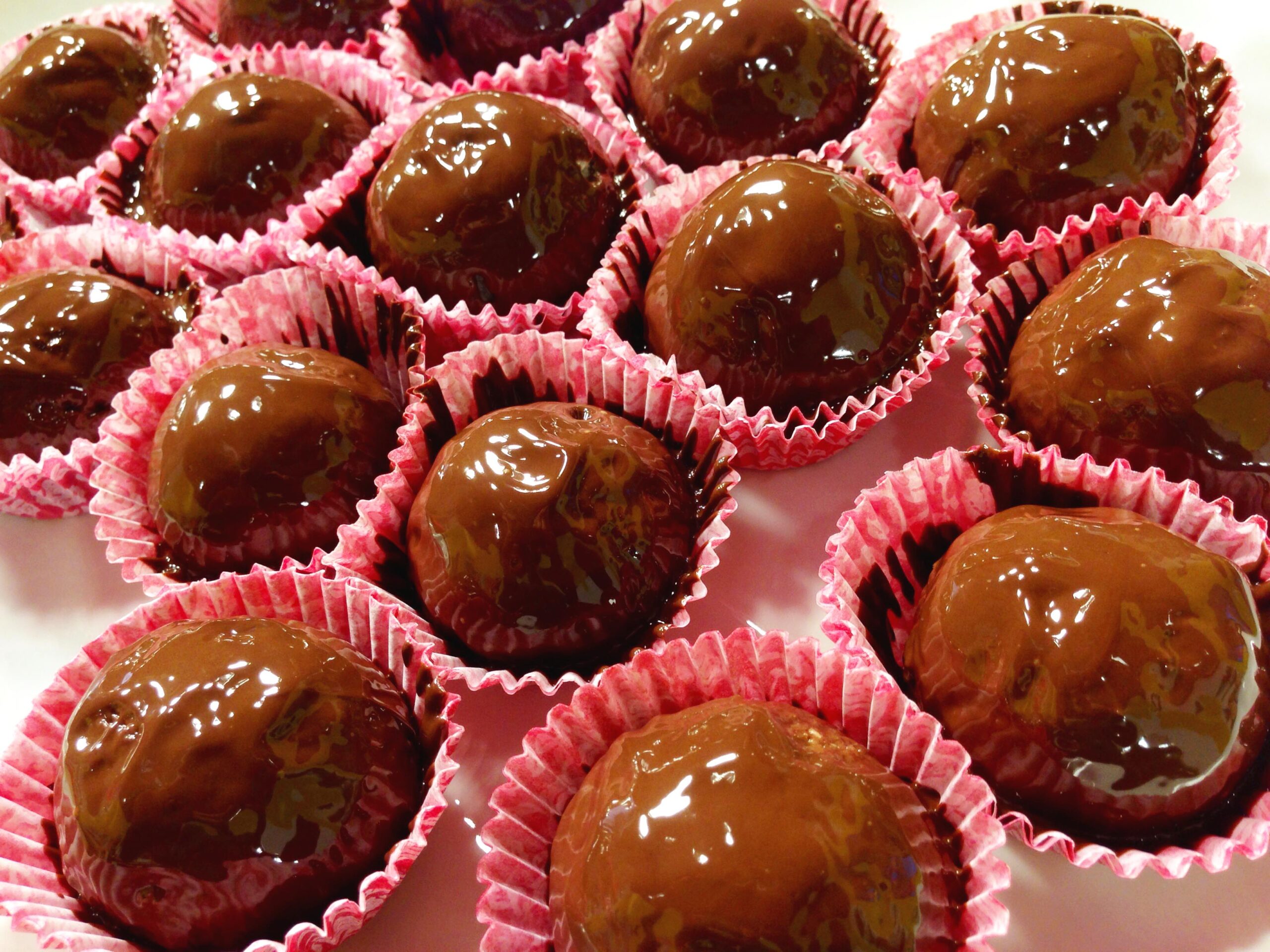 Immergere, ad una ad una, le palline di cocco nel cioccolato fuso.