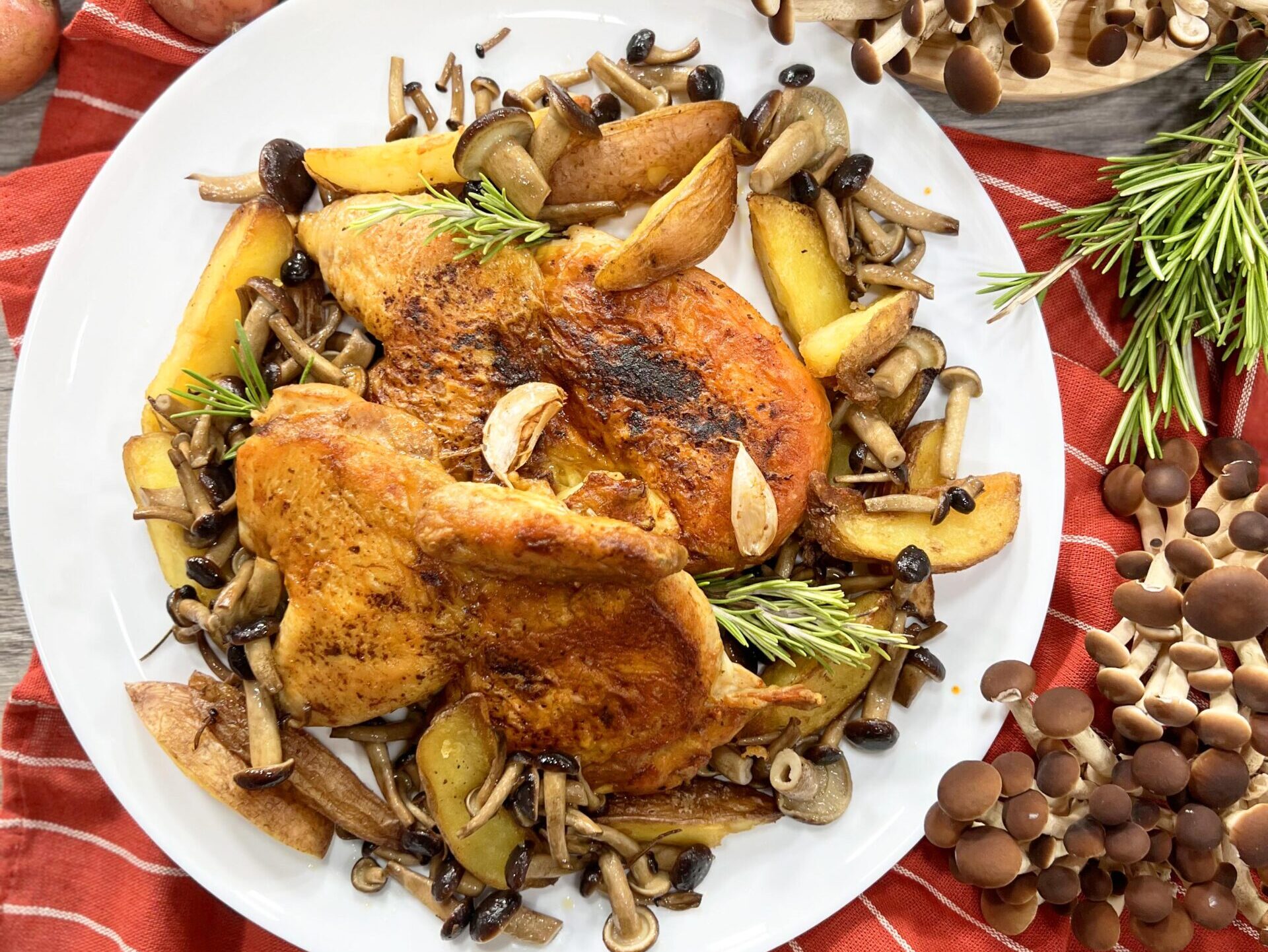 - Servi il galletto alla diavola ben caldo, accompagnato dai funghi saltati. Puoi rimuovere lo spicchio d’aglio dai funghi prima di servirli.