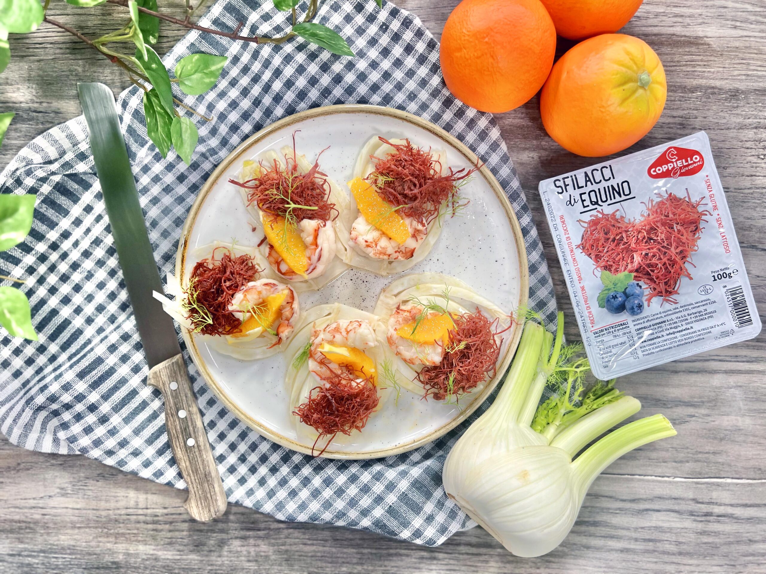 - Impiattate mettendo i finocchi ben scolati ed asciugati, conditeli con la citronette di arancia e le fette di arancia, appoggiate gli scampi e glassateli con la riduzione di limone ed aggiungete gli sfilacci di cavallo per l’affumicatura.