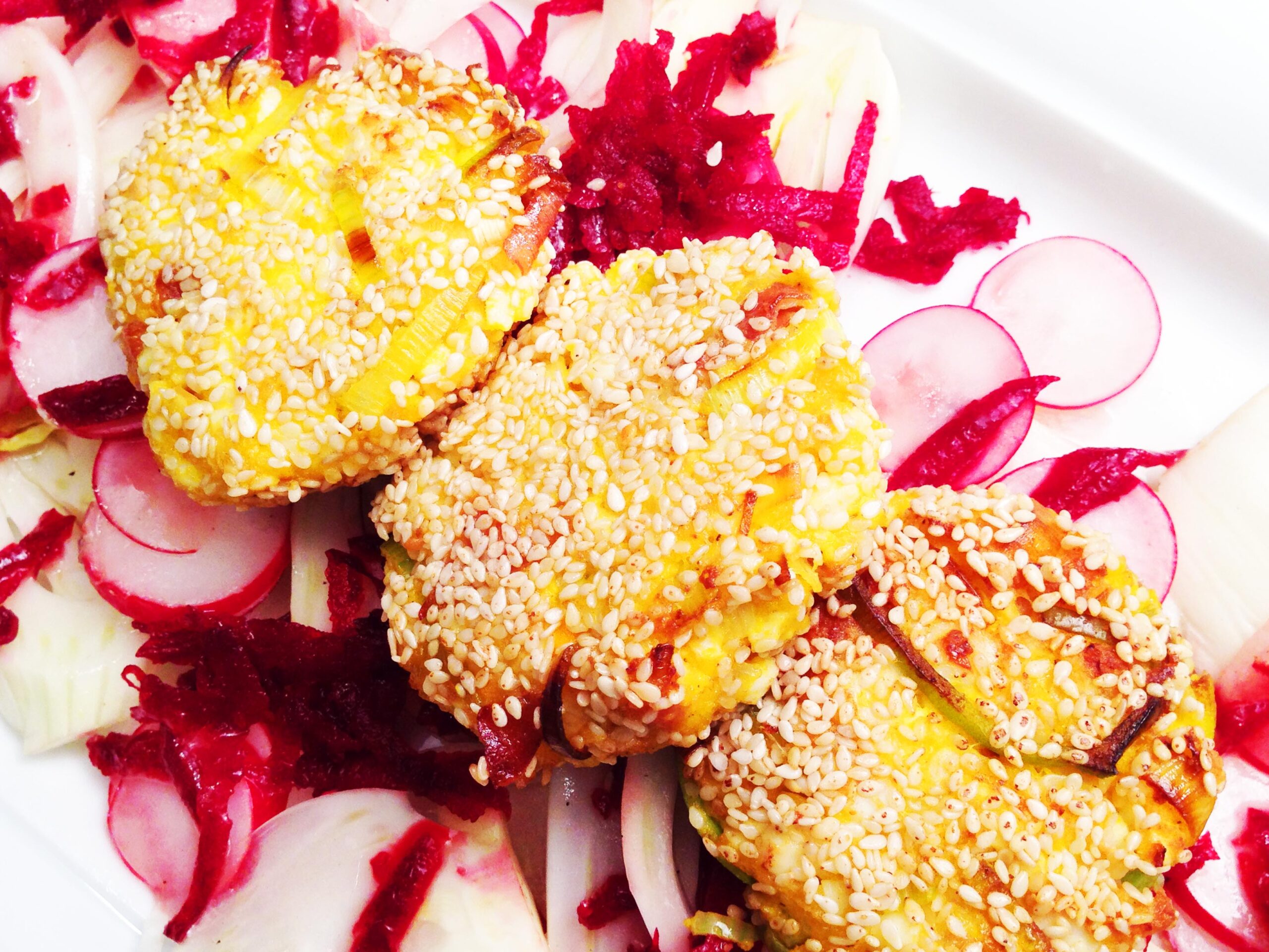 Formate tante palline e schiacciatele, panatele nei semi di sesamo, poi rosolate in una padella con olio.