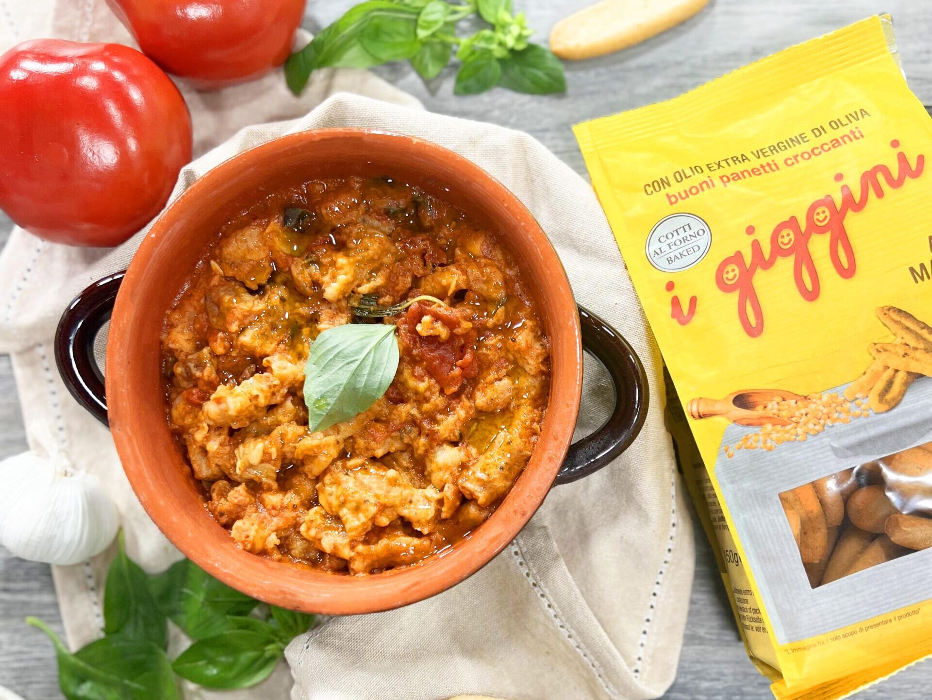 - In una padella fate rosolare gli spicchi d’aglio e, quando inizia a prendere colore, unite i pomodori pelati tagliati e il basilico