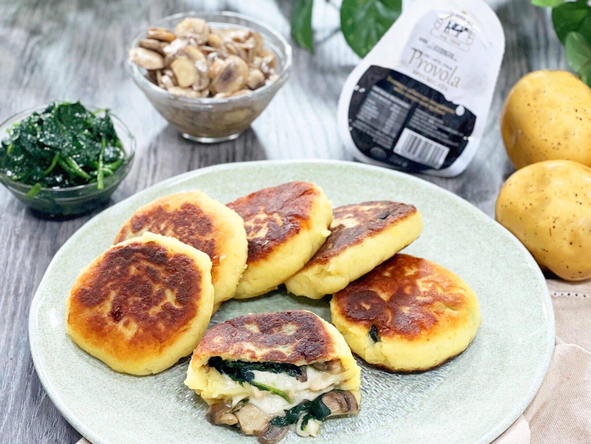 - Componiamo le nostre POTATO CAKE prendendo una manciata di impasto in una mano, creare una cavità ed inserire scamorza e funghi, spinaci e chiudete formando per prima delle palle e poi adagiate su un piatto schiacciandole formando delle tortine.