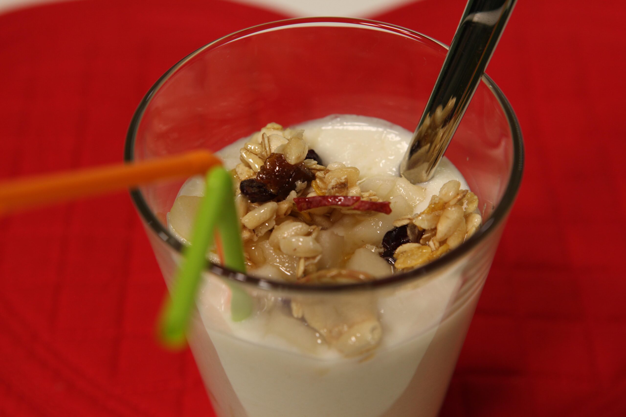 Versate in un bicchiere e decorate con il muesli e il riso soffiato.