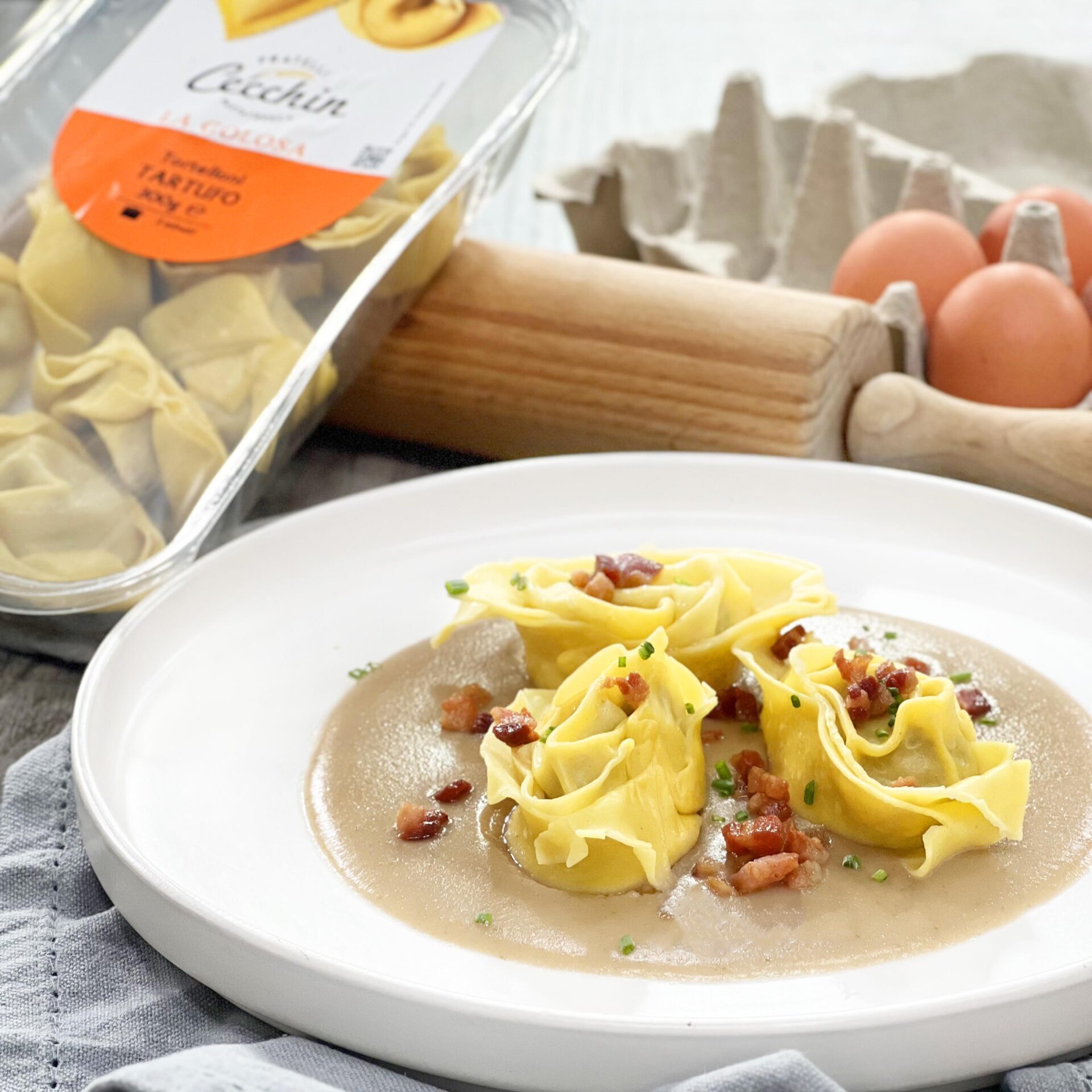 - Adagiare delicatamente i tortelli sopra la vellutata.
