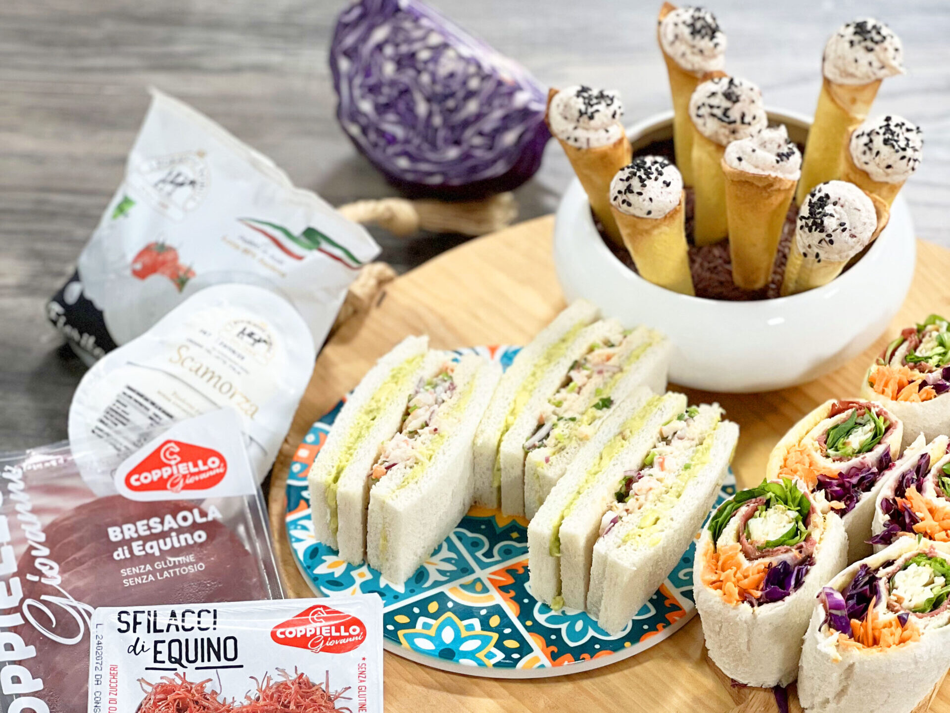 - Ora avvolgete una parte di pane con dentro la bresaola ed il cavolo cappuccio facendo un rotolino, poi fate lo stesso mettendo le carote, poi la provola con gli spinaci.